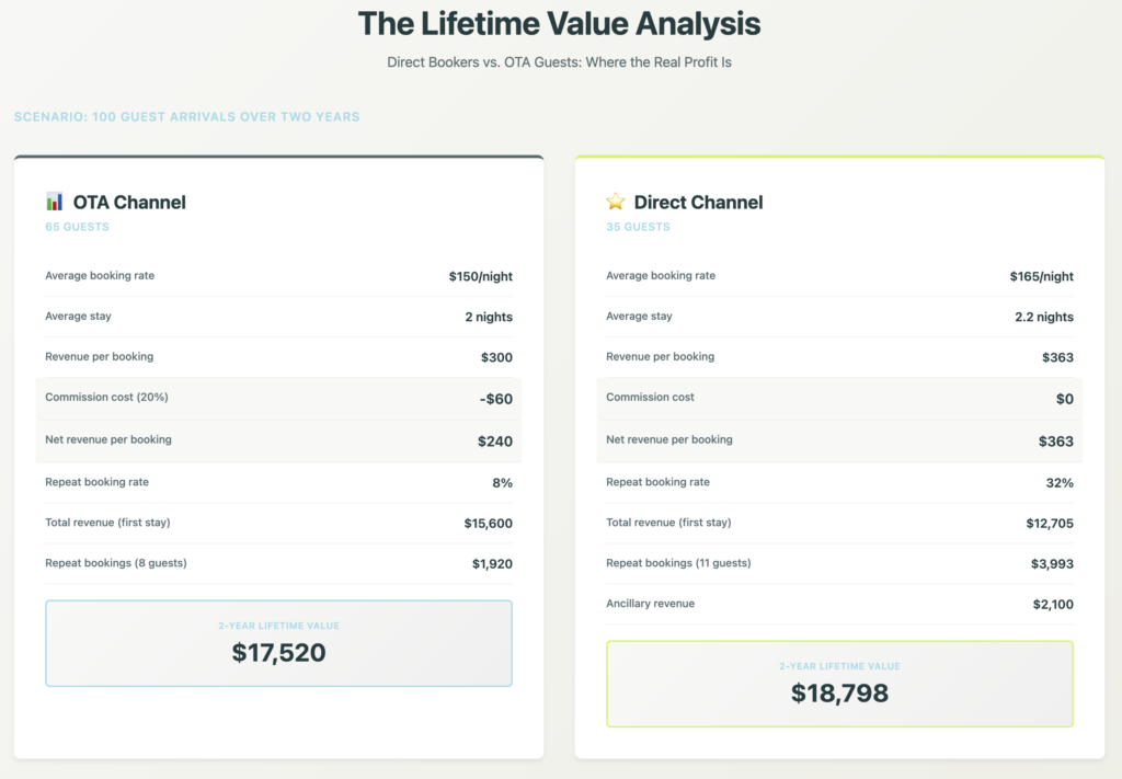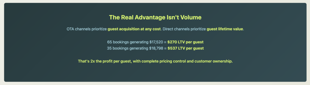 A $200 direct booking stays $200. It generates $40-80 in additional upsell revenue. The guest lands in your database and becomes a repeat-booking candidate.