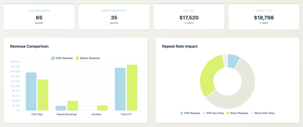 If you’re like most hotels, direct booking LTV is 2-3x higher than OTA LTV. The profit margin difference is even starker.